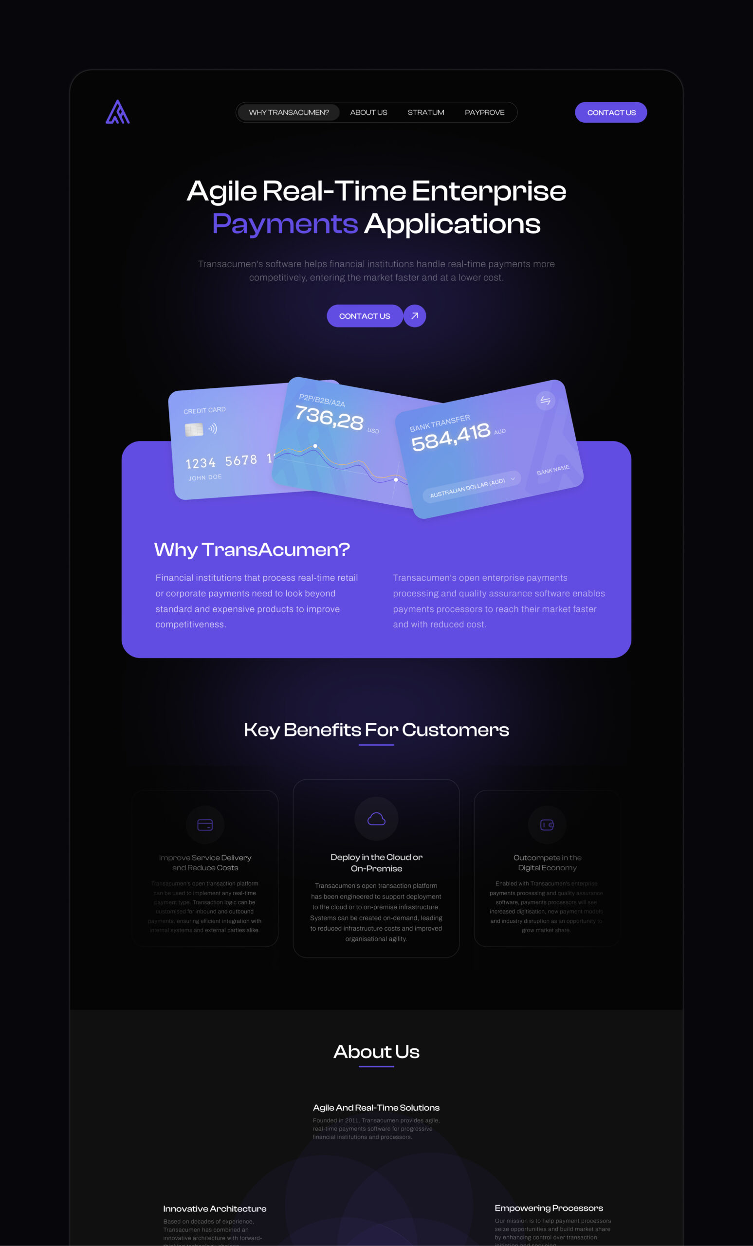 A digital presence that communicates Transacumen’s advanced technology and reliability. The design integrated complexity with clarity, and reinforced credibility in real-time payments.